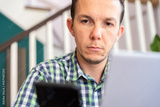 Serious Man Holding Smartphone While Working On Laptop At Home Office Remote Work