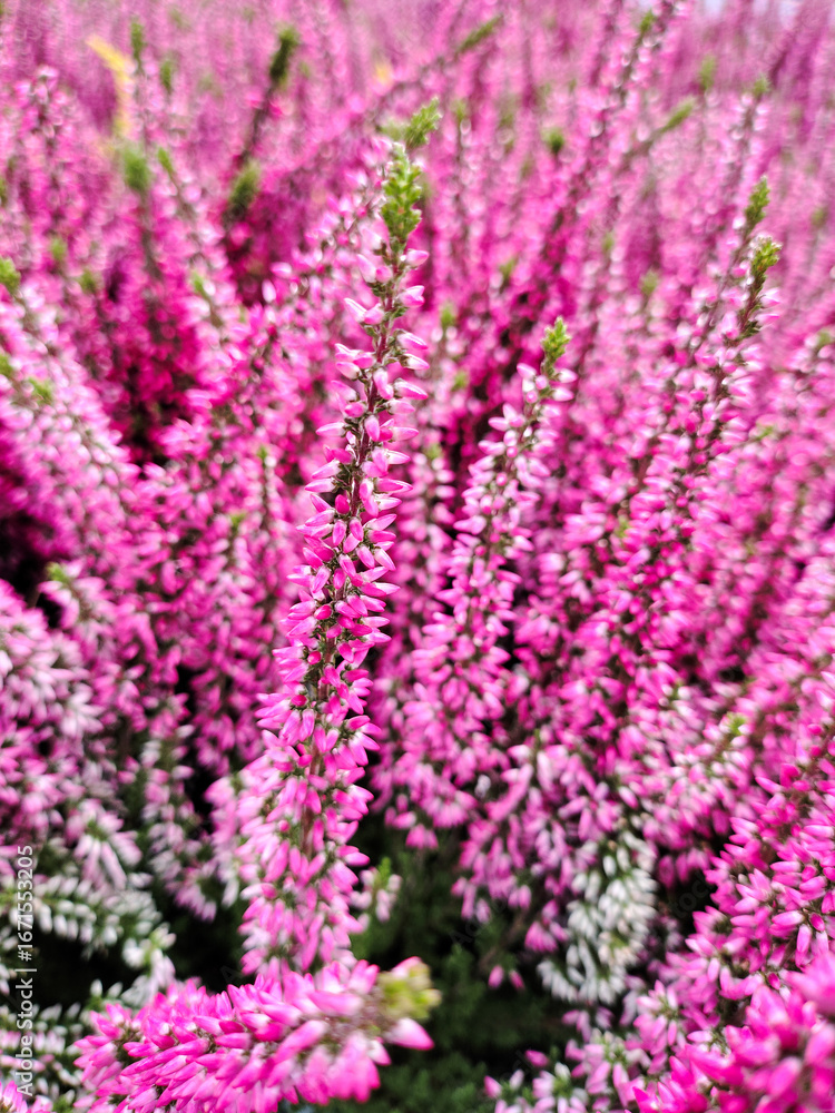 Heather, small colorful flowers, autumn in the garden.