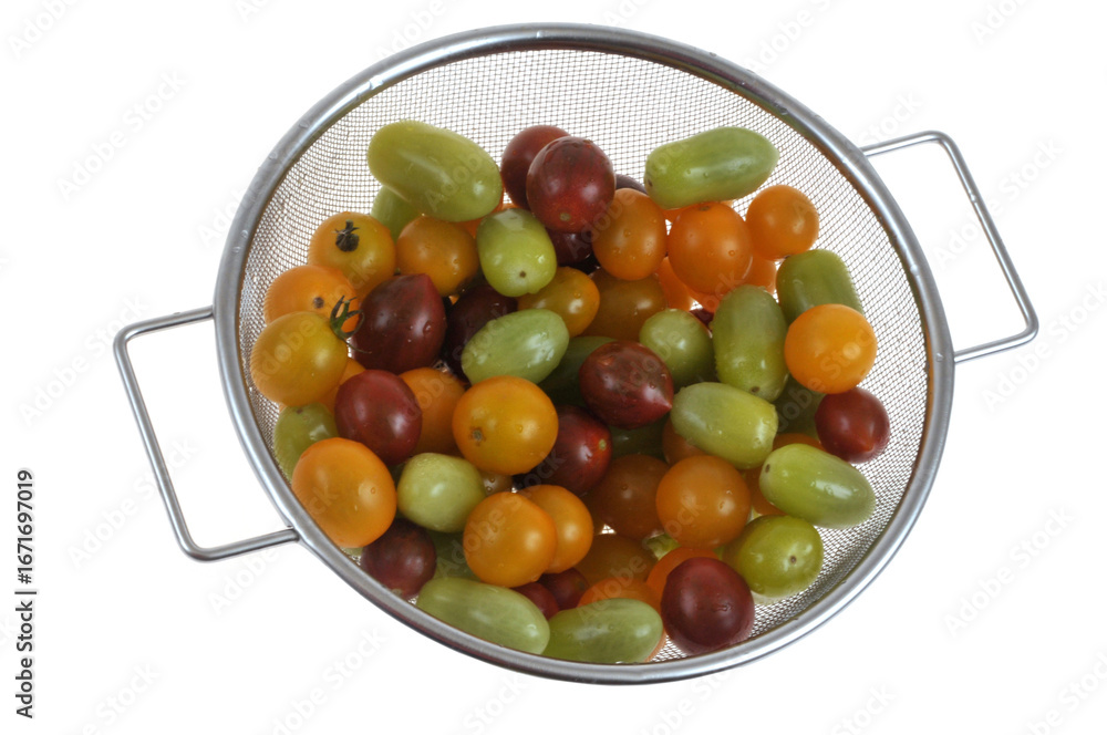 Tomates cerises de différentes couleurs et saveurs dans une passoire vue de dessus en gros plan isolées sur fond blanc