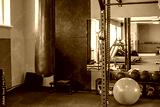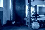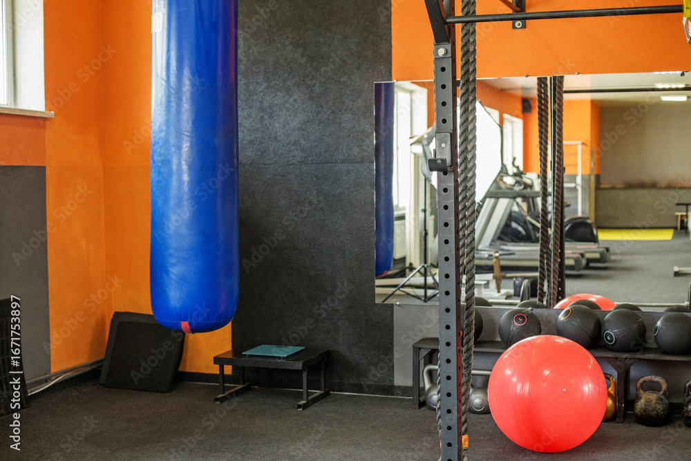 Boxing bag and fitness equipment in gym corner