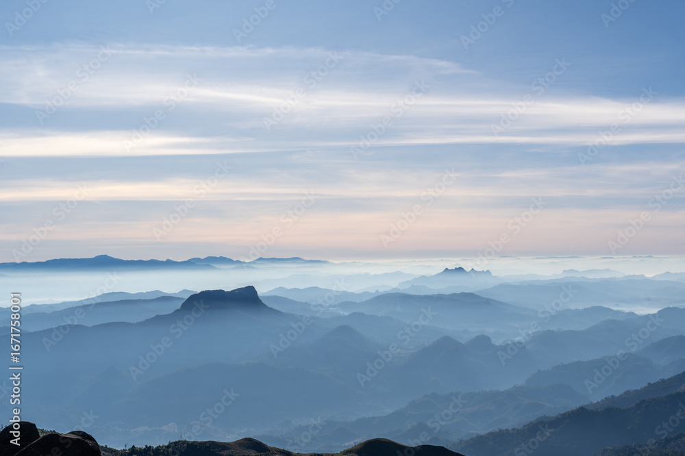 Ethereal mountain scene showcasing intricate layers of overlapping peaks shrouded in delicate mist at Mount Mulayit, Myanmar.