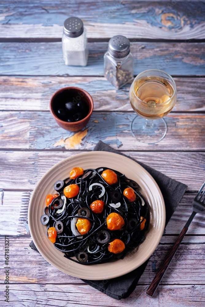 Black pasta with roasted tomatoes and black olives in a plate