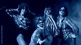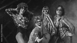 Glam retro group expressing charisma with colorful disco outfits. Concept of 70s inspired fashion, pop culture events, nostalgia lifestyle and vibrant party identity