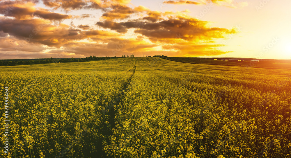 Yellow bright flowers bloom in a field of rapeseed at sunset light, creating a beautiful summer landscape. Agricultural business concept image. Vintage film asthetic.