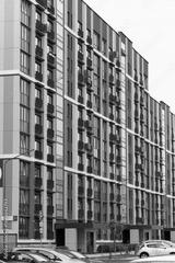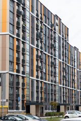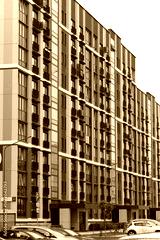 Modern high-rise apartment buildings line a residential street, showcasing diverse architecture and urban living options in a vibrant neighborhood