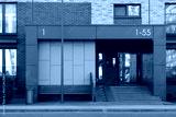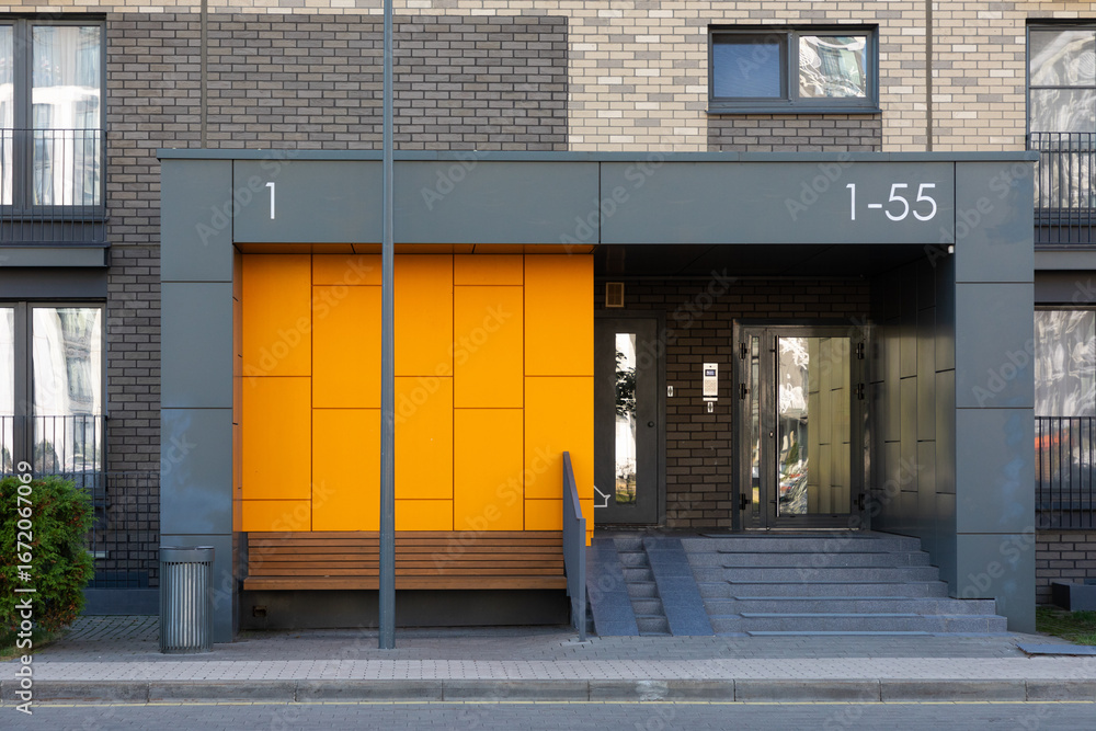Modern residential entrance of high-rise apartment building in urban area emphasizing rental and property insurance
