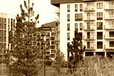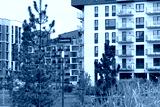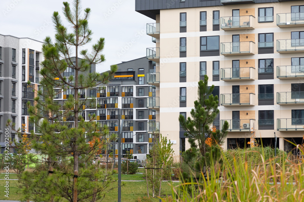 Modern high-rise apartment buildings in a residential area surrounded by greenery, showcasing urban living options