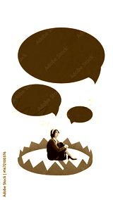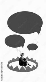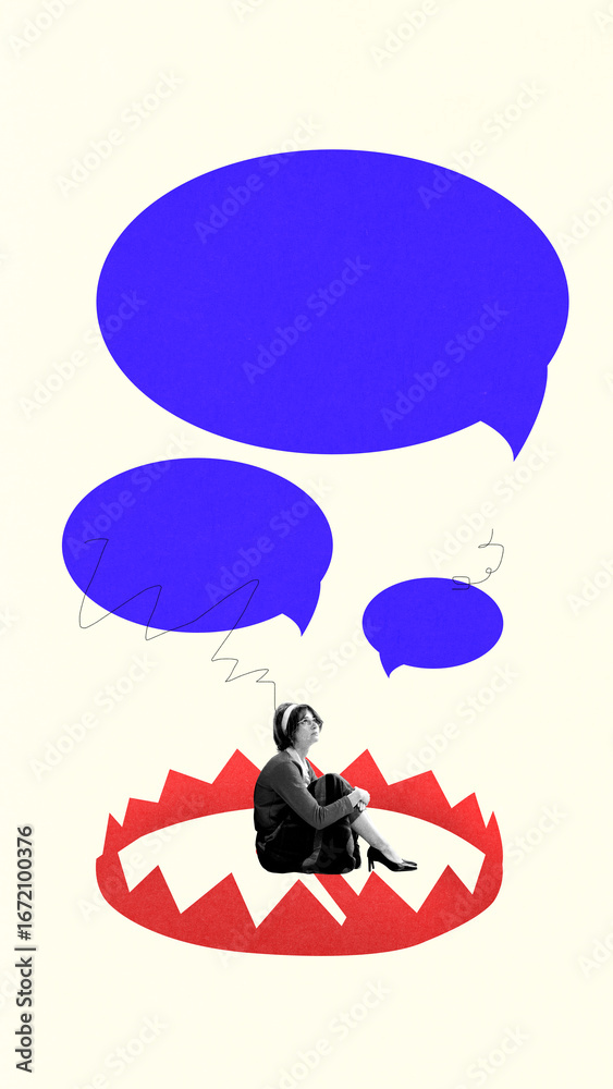 Graphic collage. Woman trapped inside red bear trap with speech bubbles overhead. Concept of emotional manipulation, toxic communication, psychological pressure, and mental health struggles.
