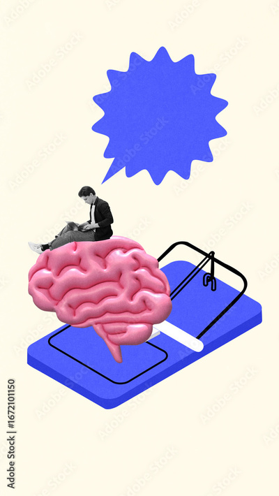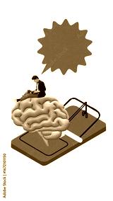 Composition of student on pink brain near blue mousetrap with speech bubble. Concept of cognitive bias, critical thinking, educational traps, psychological manipulation and hidden knowledge risks.