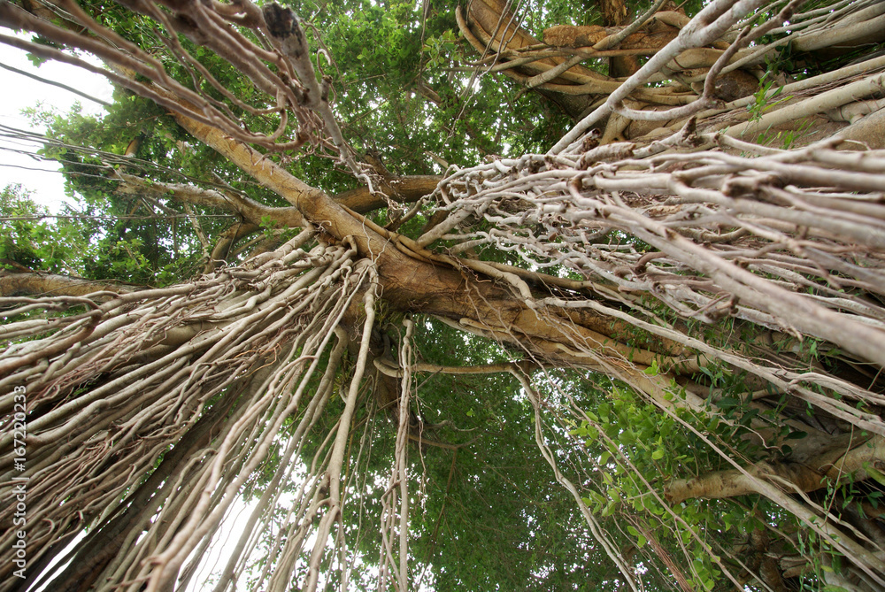 Banyan tree trunk and branches in Mendut Temple area, located near Borobudur Temple, Java, Indonesia