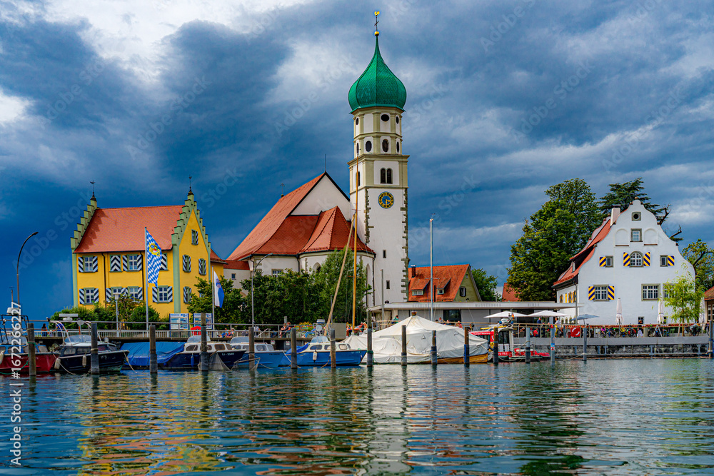 Blick vom hafen auf die pittoreske Halbinsel Wasserburg am Bodensee, mit der Kirche St. Georg und dem Museum im Malhaus