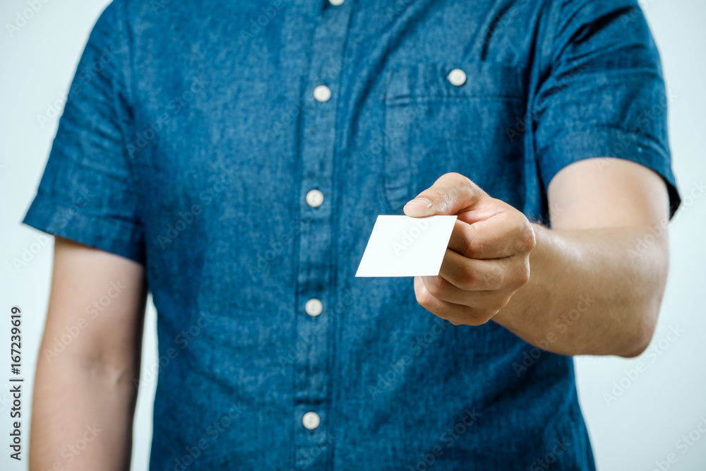 Man in jeans shirt showing blank white business card for you to give