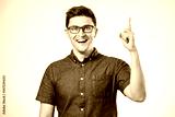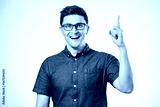 Handsome smiling bearded man pointing away