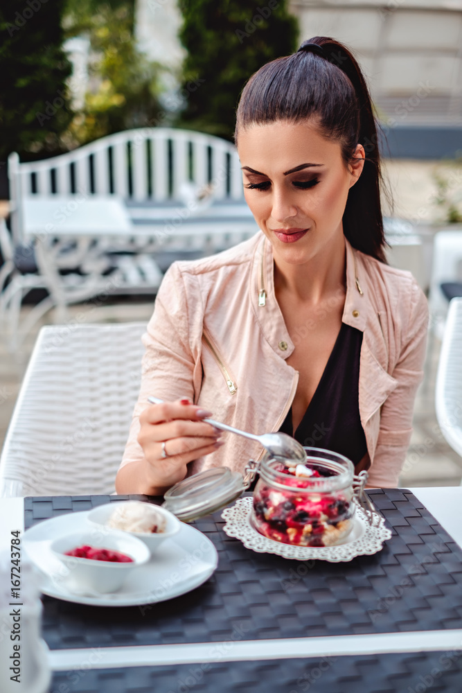 Beautiful girl eating fruit vanilla cake in the restaurant