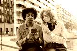 Two women are sitting together, deeply focused on their smartphones, displaying expressions of concern and disappointment as they interact with their mobile devices in an engaging manner.