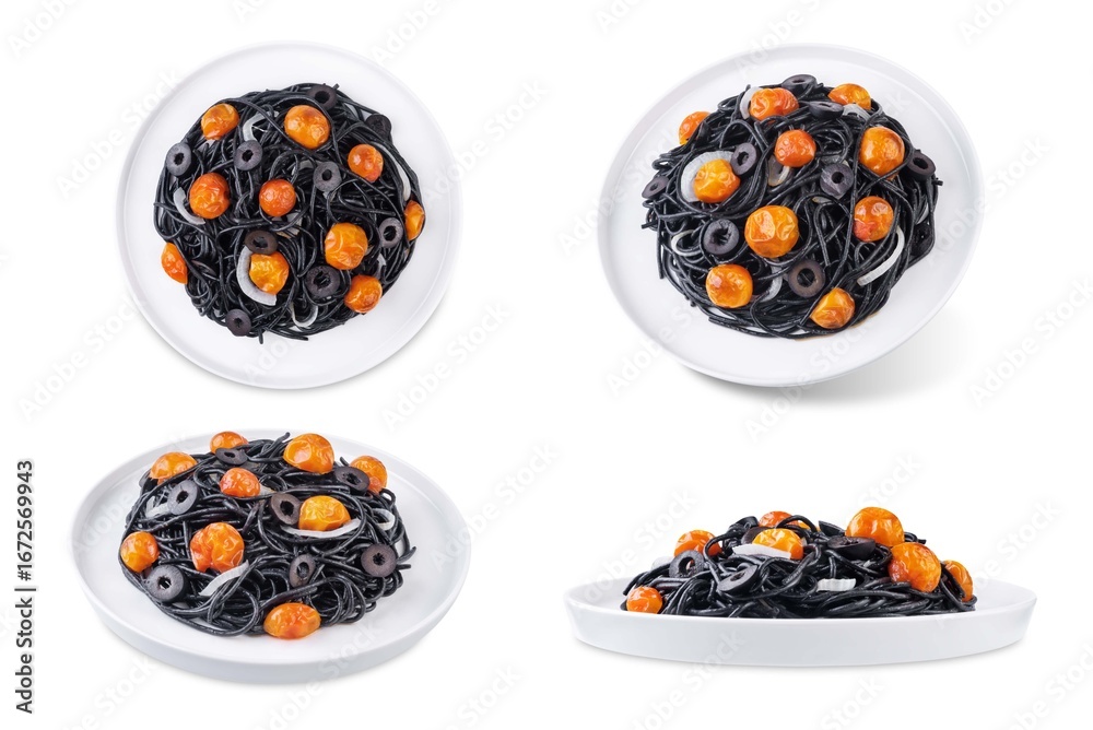 Black pasta with roasted tomatoes and black olives in a plate on a white isolated background