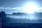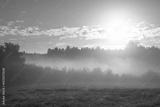Sierpniowy poranek nad łąkami. Jest słoneczny dzień, nad ziemią unosi się kłębiasta mgła przysłaniająca krajobraz. Wschodzące słońce rozświetla mgłę.