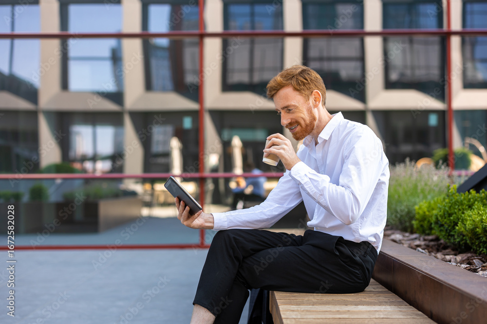 Businessman in suit with beard using tablet while sitting on bench and drinking takeaway coffee