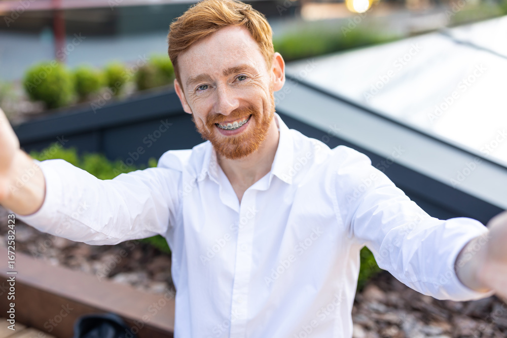 Handsome bearded man with ginger hair dressed in white shirt capturing pov selfie