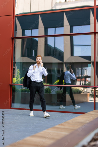 Red-haired man in white shirt talking on smartphone in modern city environment