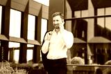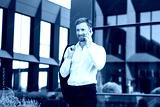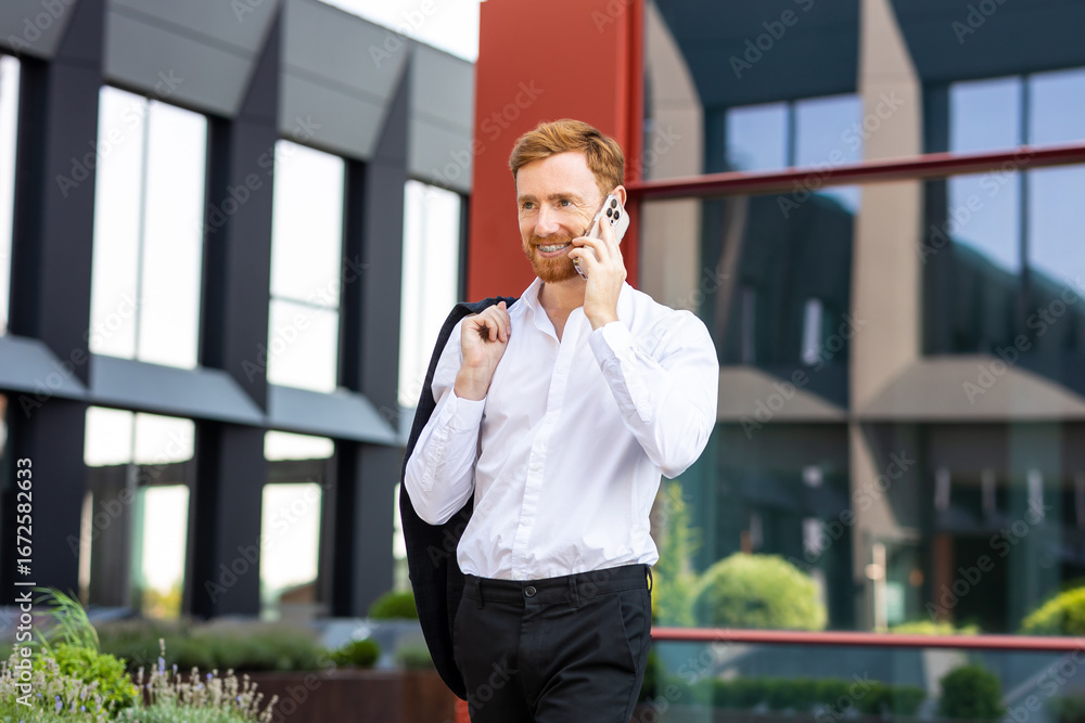 Red-haired man in white shirt talking on smartphone in modern city environment