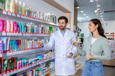 Bearded caucasian male pharmacist demonstrating medicines in the pharmacy to female customer