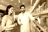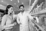 Bearded caucasian male pharmacist demonstrating medicines in the pharmacy to female customer