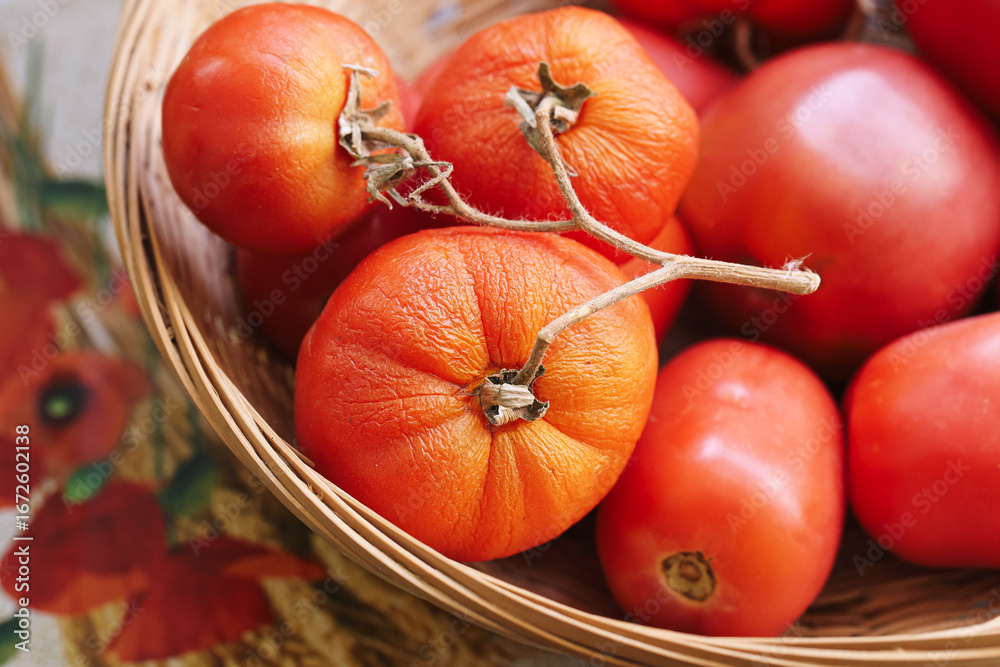 Basket with fresh and wrinkled tomatoes. Ripe organic vegetables in wicker bowl. Healthy natural food with imperfections. Concept of nutrition, harvest, farming, waste reduction and eco lifestyle