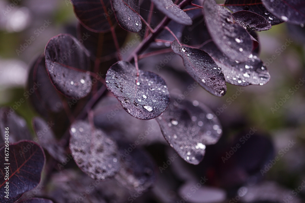 Cotinus, the smoketree, dark red leaves with morning dew, natural macro floral background