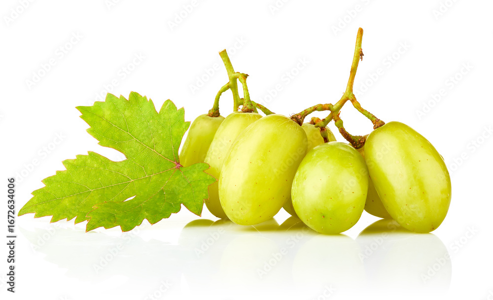 Cluster of ripe White grapes with green leaf. Yellow organic natural fruit isolated on white background.