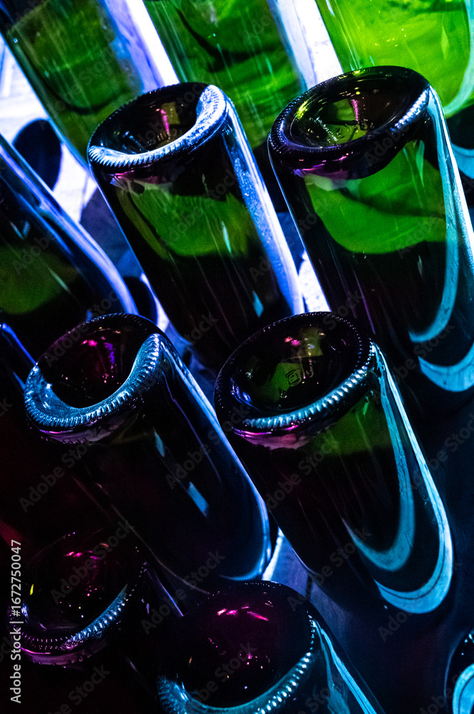 Aging and riddling of wine in champagne bottles in caves, traditional method of production of cremant, blanquette sparkling wine Limoux, Occitania, France