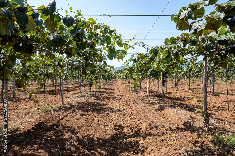 New harvest of golden or green kiwi, hairy fruits hanging on kiwi tree in orchard in Italy, Lazio