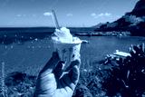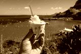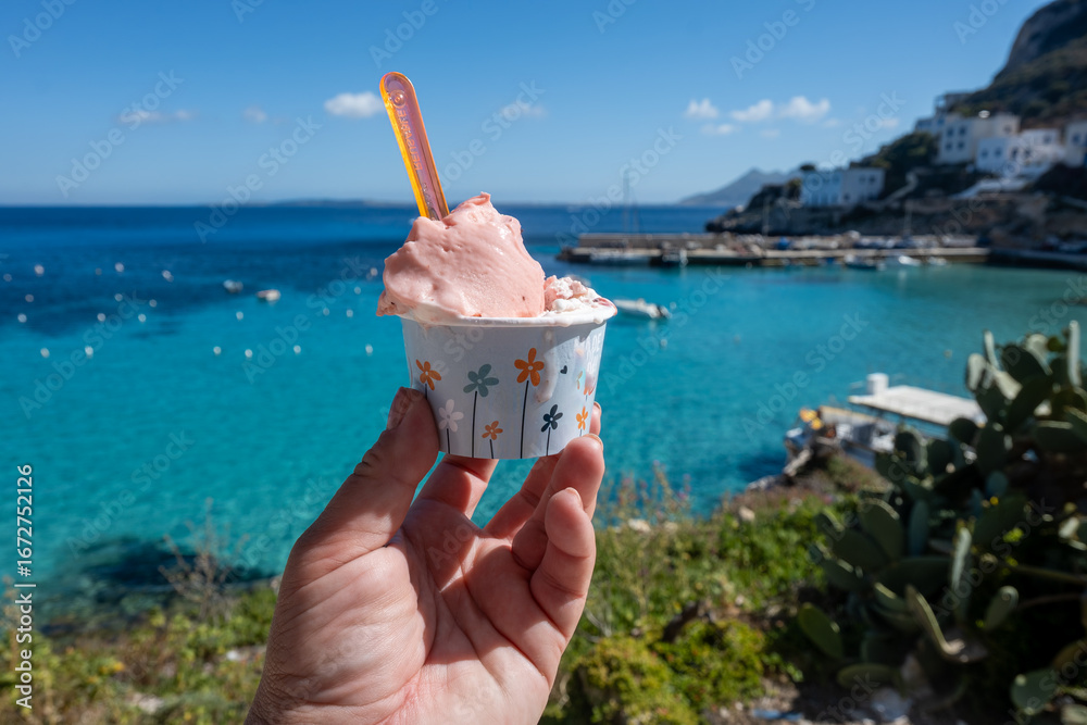 Eating of fresh made ice cream with view on blue bay of Levanza island, Egadi near Sicily, Italy