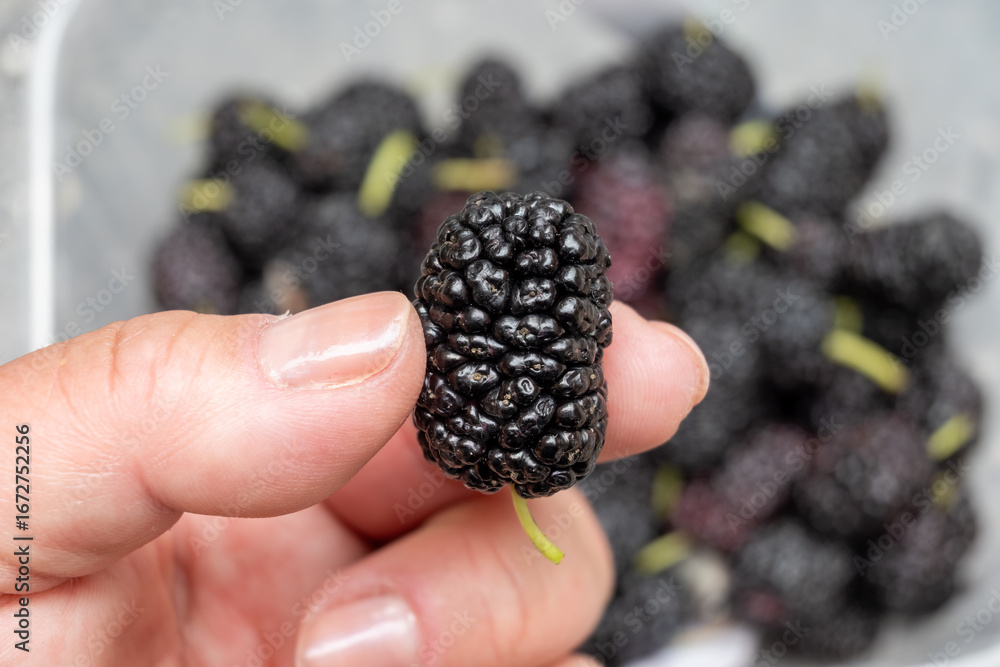 Tasty ripe black violet sweet juicy mulberry berries in boxes on food market in Palermo, Sicily, Italy