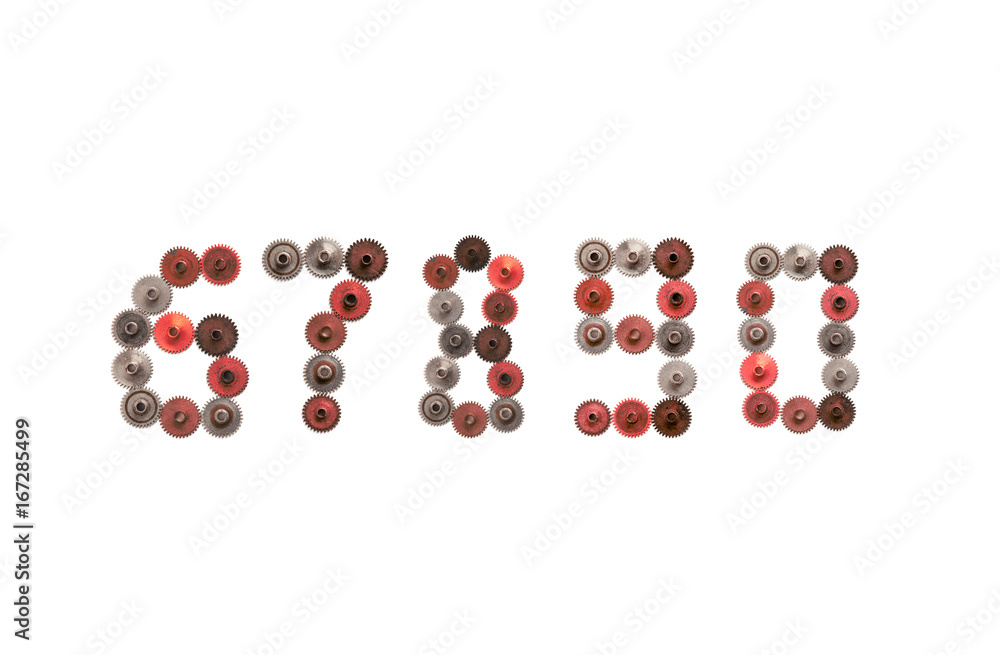 6 7 8 9 0 Vintage gears cogwheels steampunk style mechanical digit numbers six seven eight nine zero. Rusty iron red bronze metal textured shapes, aged mechanism wheels. White background