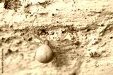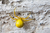 Yellow spider insect on stone wall background. Misumena vatia Goldenrod flower Crab Spider. Macro view, selective focus photo.