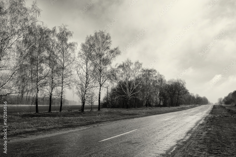 Black white photography countryside empty road, birch tree forest, cloudy weather landscape