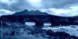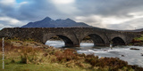 The beautiful old bridge crossing a river in front of the Black Cuillin mountain scenery from Glen Brittle on the Isle of Skye, Scotland