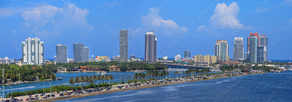 Panoramic view of Star island and South beach condominiums in Miami, Florida on a sunny day.