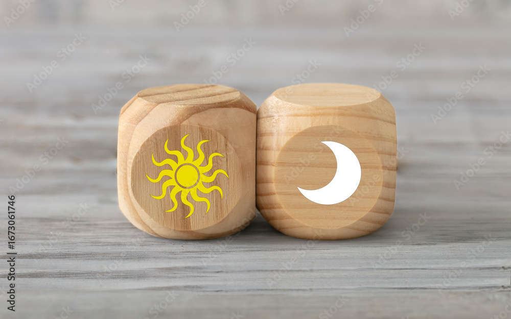 Mourning and night concept. Abstract geometric wooden dice. AM, PM icon. Sun and moon.