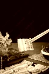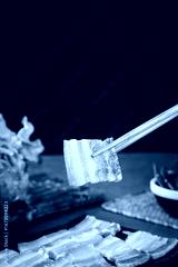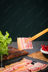 Raw Bacon Strips with Chopsticks Korean BBQ Style Food Preparation on Dark Background