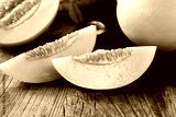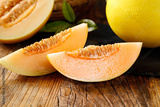 Fresh Sliced Honeydew Melon with Golden Sweet Flesh on Wooden Table