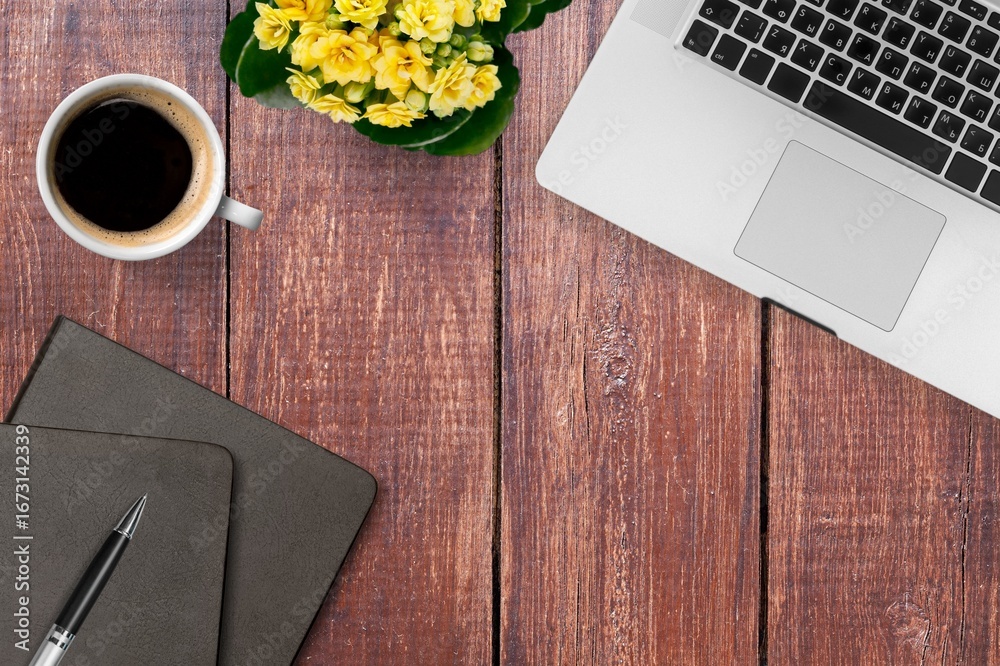 Simple workspace with coffee, laptop and plant