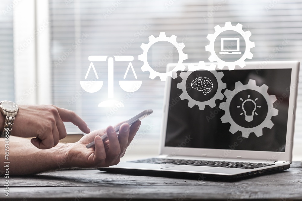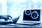intellectual property with businessman holding justice icons