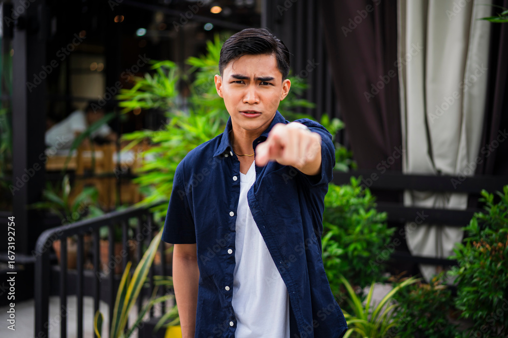 A young Asian man in a navy shirt and white tee points directly forward, looking intense or frustrated as if calling someone out in a lively outdoor café setting.
