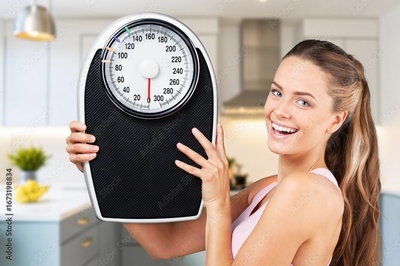 Diet and weight loss. Young woman hold floor scale