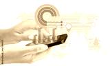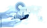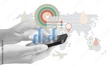 Hand holding modern smartphone with data visualizations
