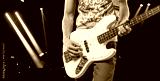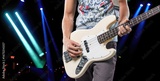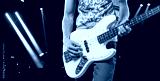Bassist's music man hands playing on guitar