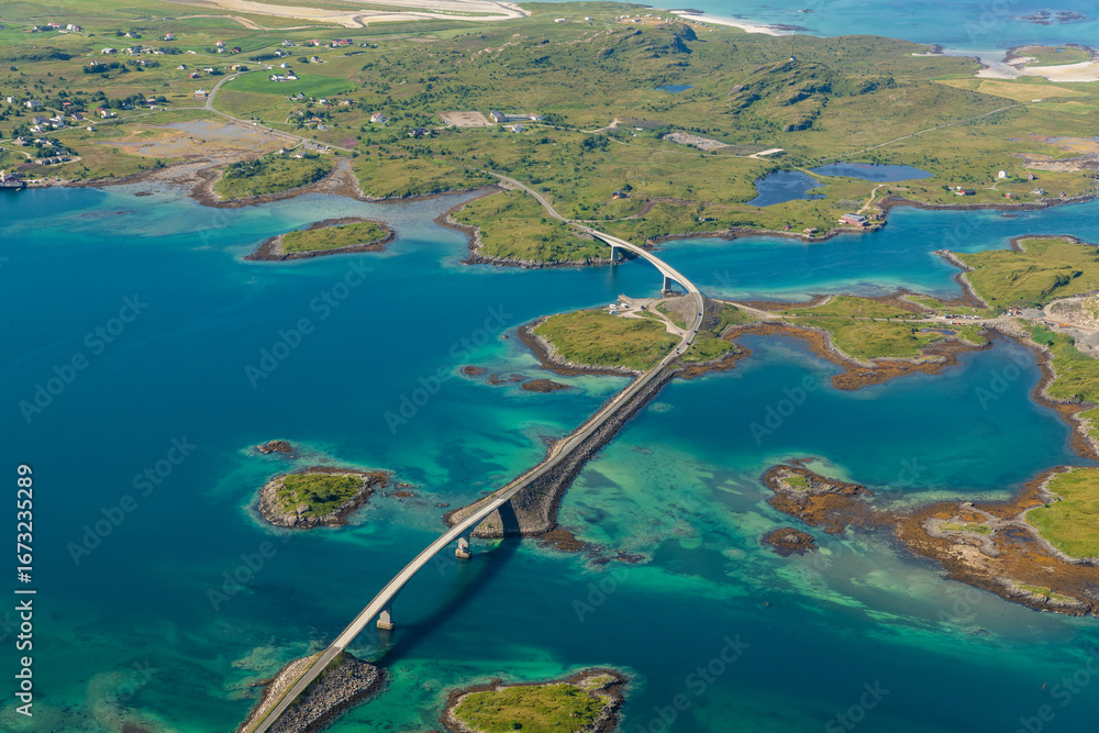 View from Volandstinden peak with surrounding islands and bridges of Fredvang. Stunning view on beautiful islands. Mountains in background. Fjords and ocean. Arctic Norway, Lofoten. Hiking Lofoten, tr