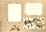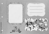 Page from an old photo album for stories. Photo album layout with empty photo frames. Scrapbooking composition with musical theme. Sheet music, piano, emotions. Music design.